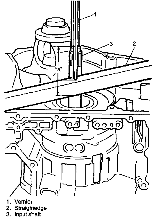 55. Check for correct installation of input shaft as follows. Measure the distance "a" by using vernier and straightedge. If out of specification, remove input shaft with 1st and reverse clutch and reinstall them properly.