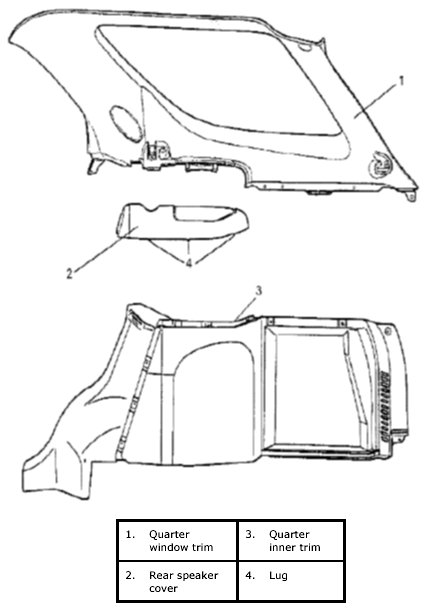 1. Remove rear speaker cover from quarter trim (3) by pushing its catching lugs (2) (at 3 locations) with flat tip screwdriver or the like (1).