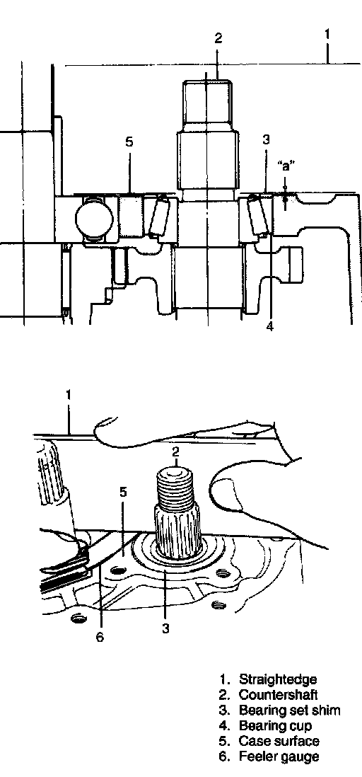 2. Put a shim on bearing cup provisionally, place straight edge over it and compress it by hand through straight edge, and then measure "a" (Clearance between case surface and straight edge) by using feeler gauge.