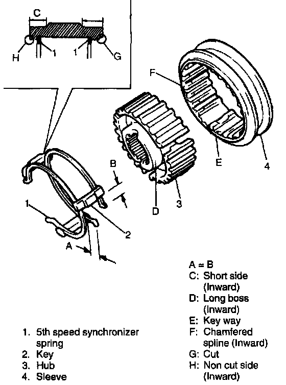 NOTE: Short side C in keys, long boss D in hub and chamfered spline F in sleeve should face inward (5th gear side).