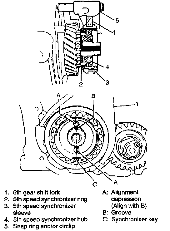 10. Fit 5th gear shift fork to sleeve & hub assembly and install them into input shaft, gear shift shaft and gear shift guide shaft at once aligning hub depression A, shaft mark B and synchronizer key C.