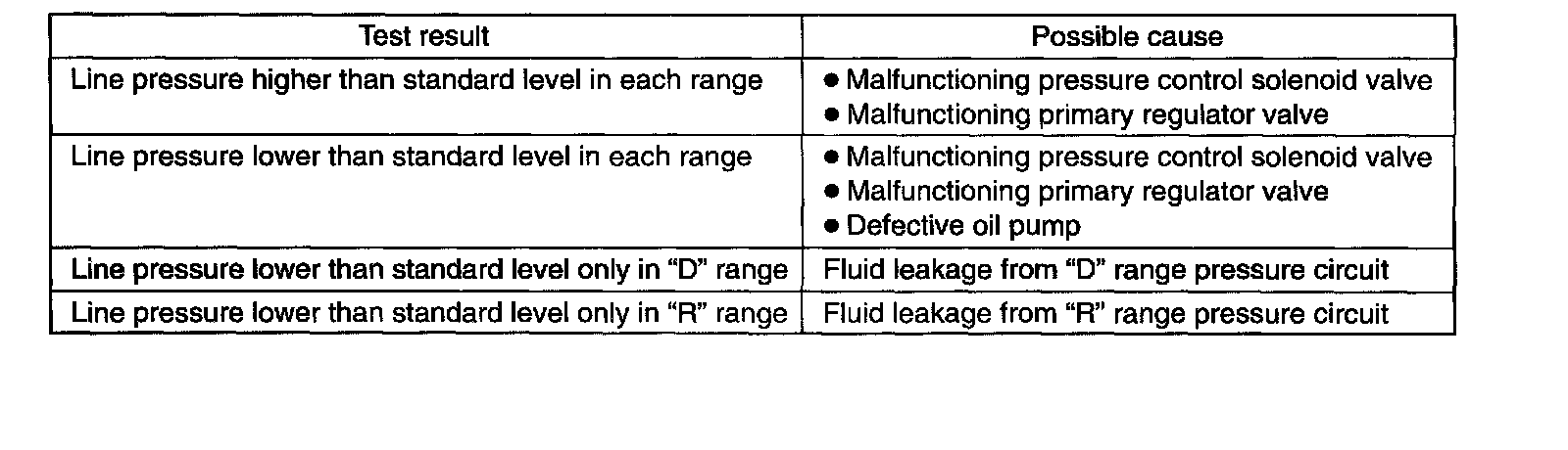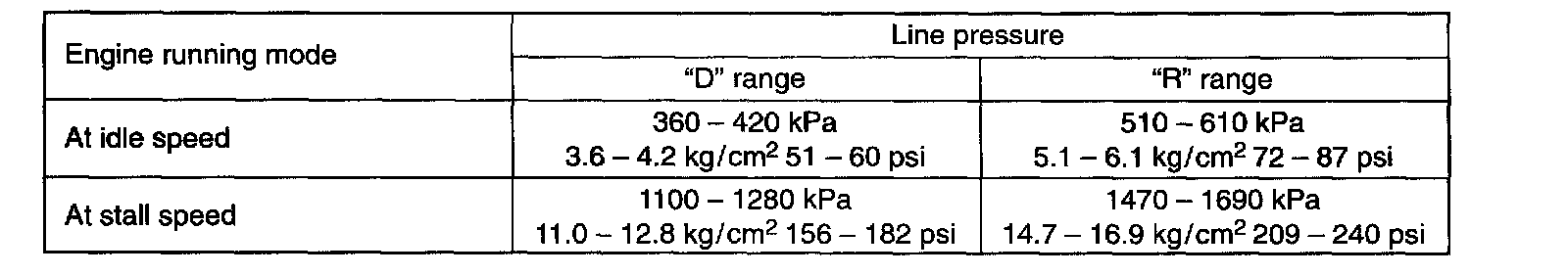 LINE PRESSURE TESTPurpose of this test is to check operating conditions of each part by measuring fluid pressure in fluid pressure line. Line pressure test requires the following conditions.