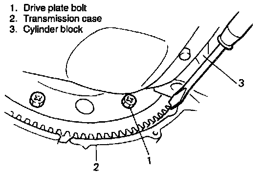 18. Holding drive plate with a large size screwdriver against rotation, remove drive plate bolts.