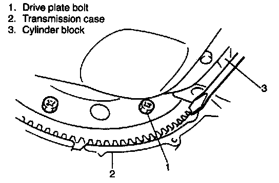 14. Holding drive plate with a proper size rod against rotation, remove drive plate bolts.