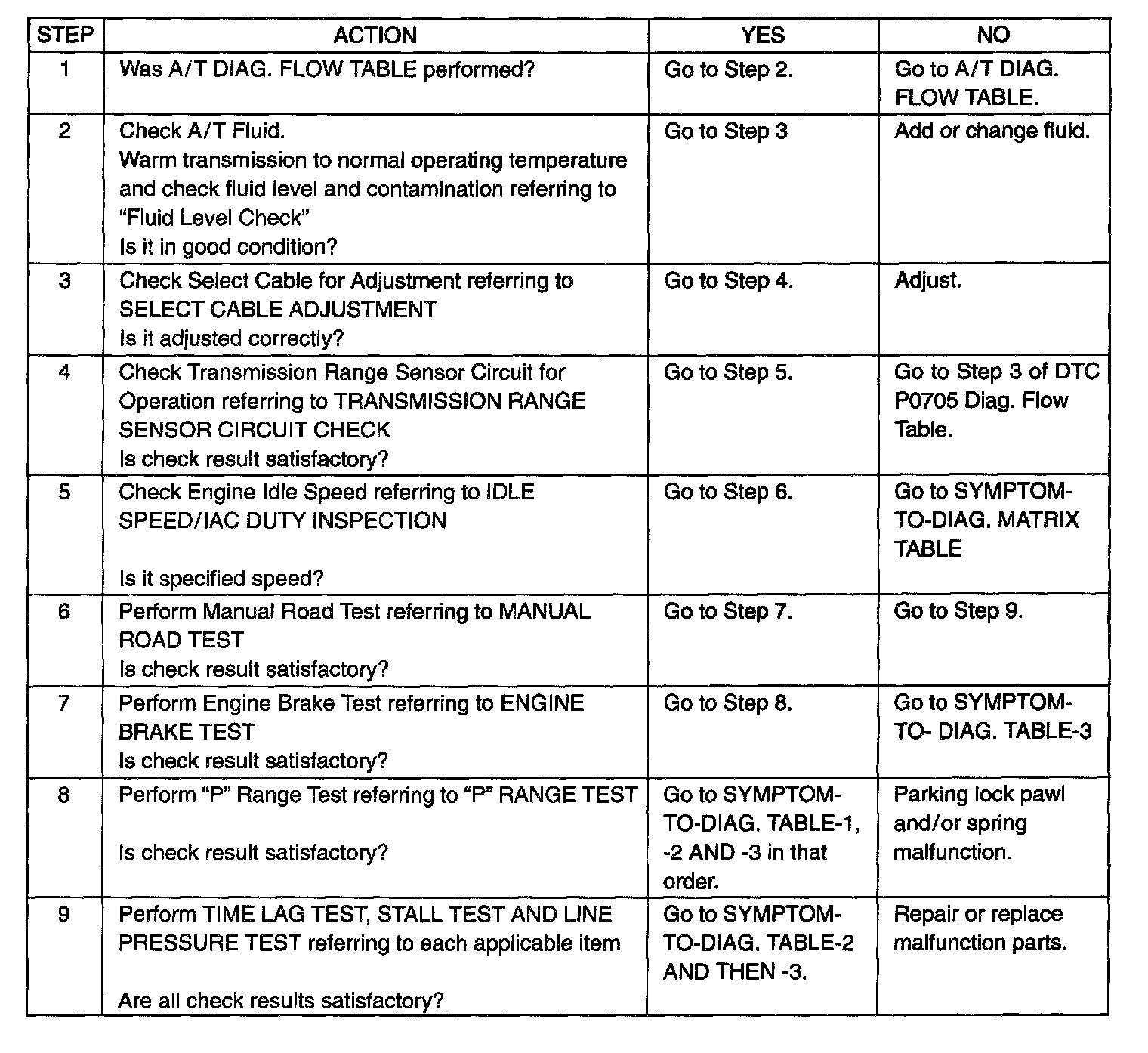 AUTOMATIC TRANSMISSION BASIC CHECKThis check very important for troubleshooting when TCM and ECM has detected no malfunction DTC and no abnormality has been found in visual inspection. Follow the flow table carefully.