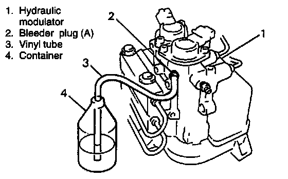 2. Attach a vinyl tube to bleeder plug (A) of ABS actuator assembly and insert the other end into container.