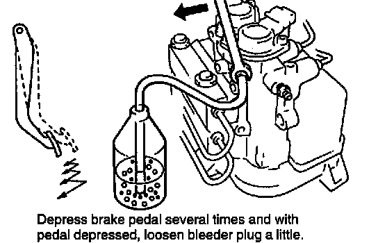 3. Depress brake pedal several times, and then while holding it depressed, loosen bleeder plug about one-third to one-half turn.