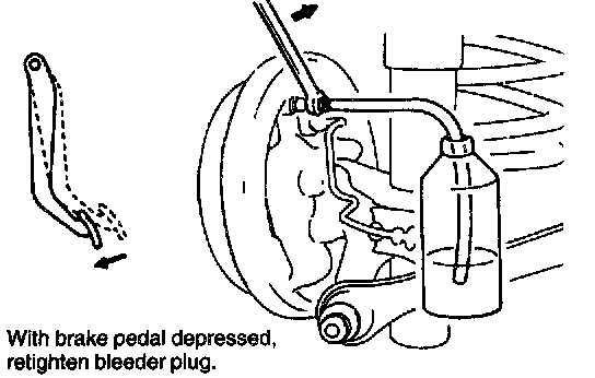 6. When bubbles stop, depress and hold brake pedal and tighten bleeder plug.