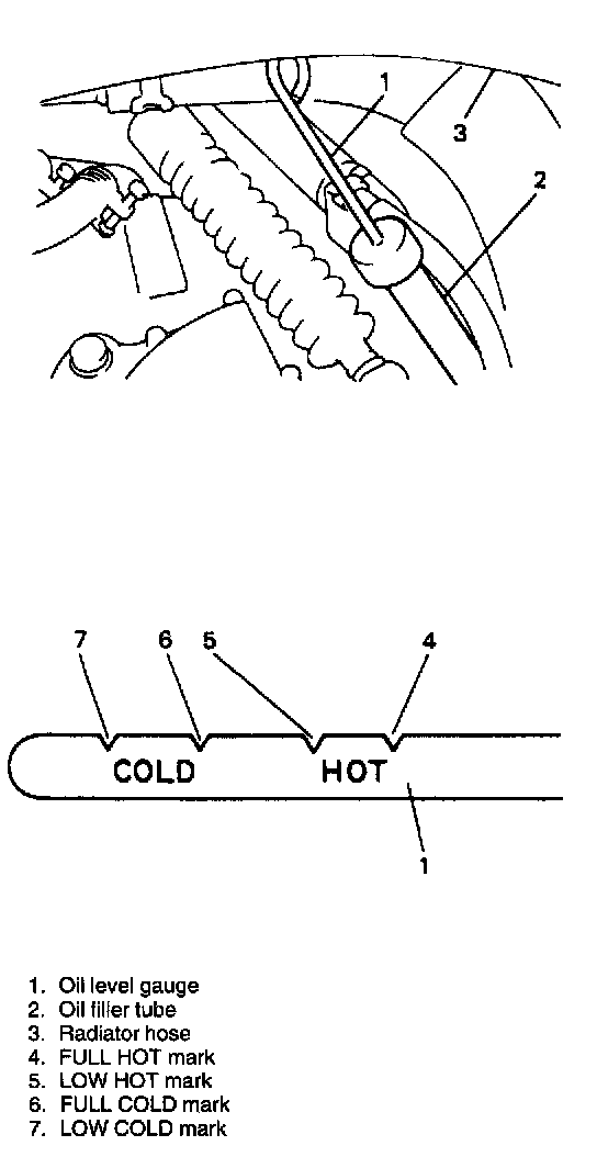5. With engine running at idle, check fluid level on oil level gauge. Fluid level should be between FULL COLD and LOW COLD marks on oil level gauge.