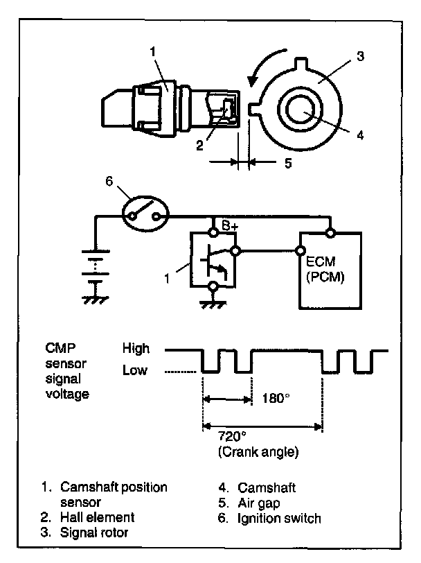 The sensor is mounted on the sensor case (distributorless ignition case) on the camshaft left side. The signal rotor is press-fitted onto the camshaft. As the sensor has a built-in hall element (element which generates voltage from changes in the magnetic flux) and a waveform forming circuit, it converts changes in the magnetic flux caused by rotation of the signal rotor into electric pulse signals. Using this signal and the signal from the CKP sensor, ECM (PCM) identifies the cylinder whose piston is in the compression stroke.