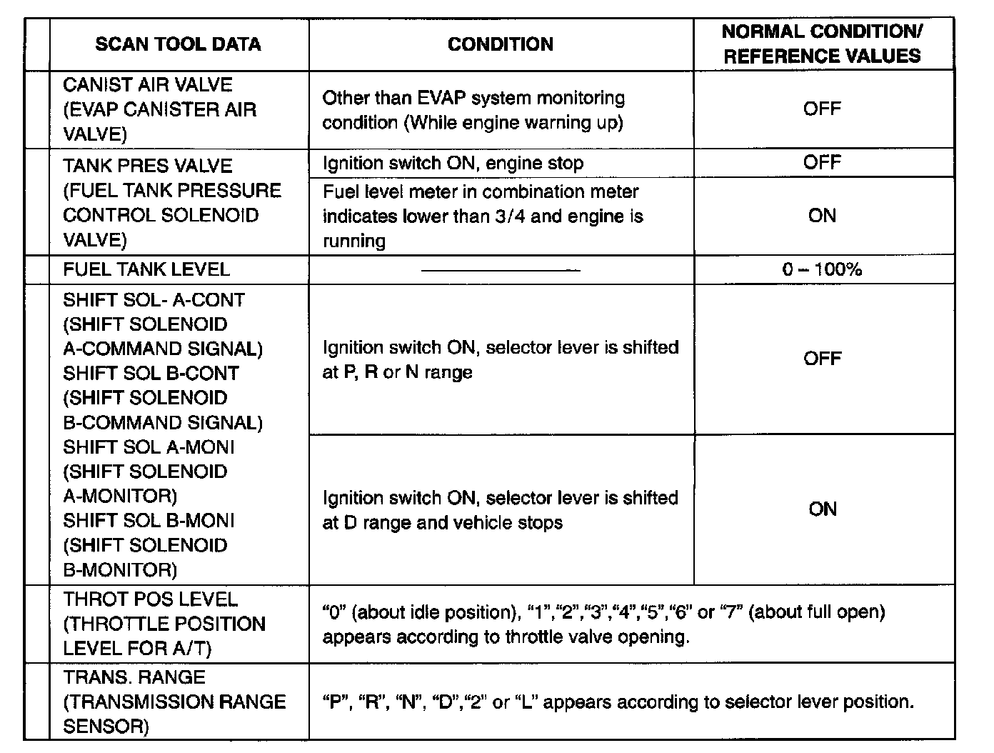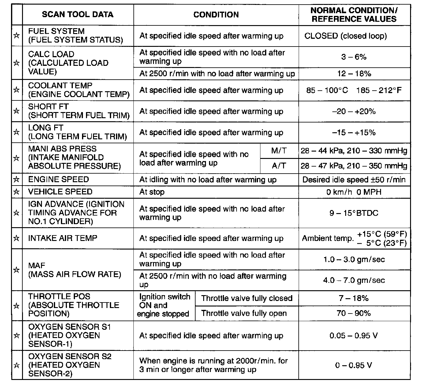 As the data values given are standard values estimated on the basis of values obtained from the normally operating vehicles by using a scan tool, use them as reference values. Even when the vehicle is in good condition, there may be cases where the checked value does not tall within each specified data range. Therefore, judgment as abnormal should not be made by checking with these data alone. Also, conditions in the table that can be checked by the scan tool are those detected by ECM and output from ECM as commands and there may be cases where the engine or actuator is not operating (in the condition) as indicated by the scan tool. Be sure to use the timing light to check the ignition timing.