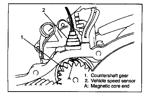 The vehicle speed sensor consists of a magnetic core with magnet and coil. It is mounted on transmission case with 0.6 mm (0.024 in.) air gap between the core end and countershaft gear tooth.
