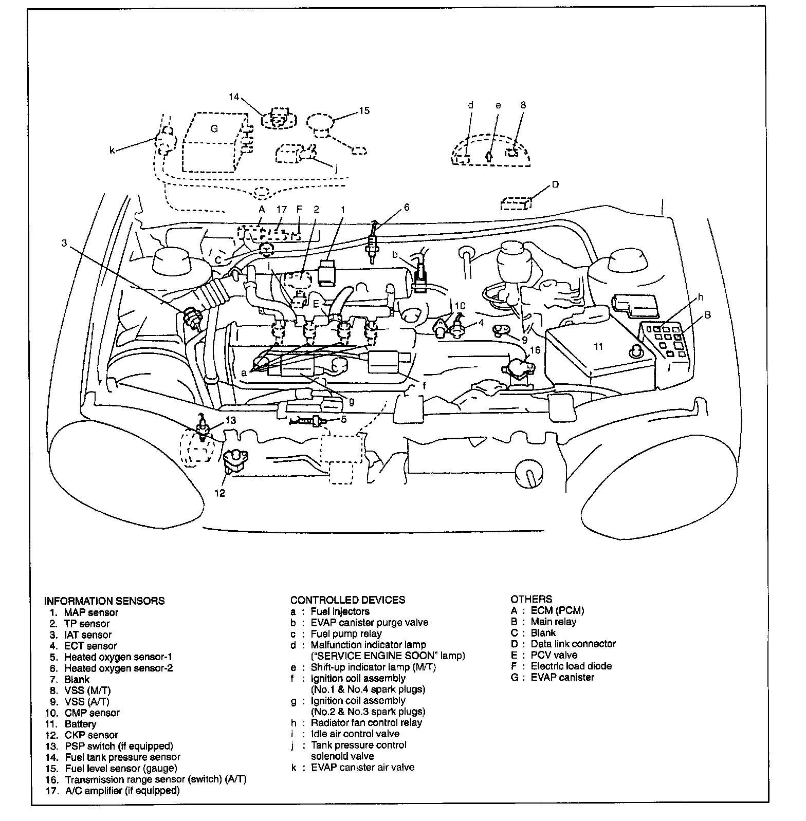 The electronic control system consists of 1.various sensors which detect the state of engine and driving conditions, 2.ECM (PCM) which controls various devices according to the signals from the sensors and 3.various controlled devices.