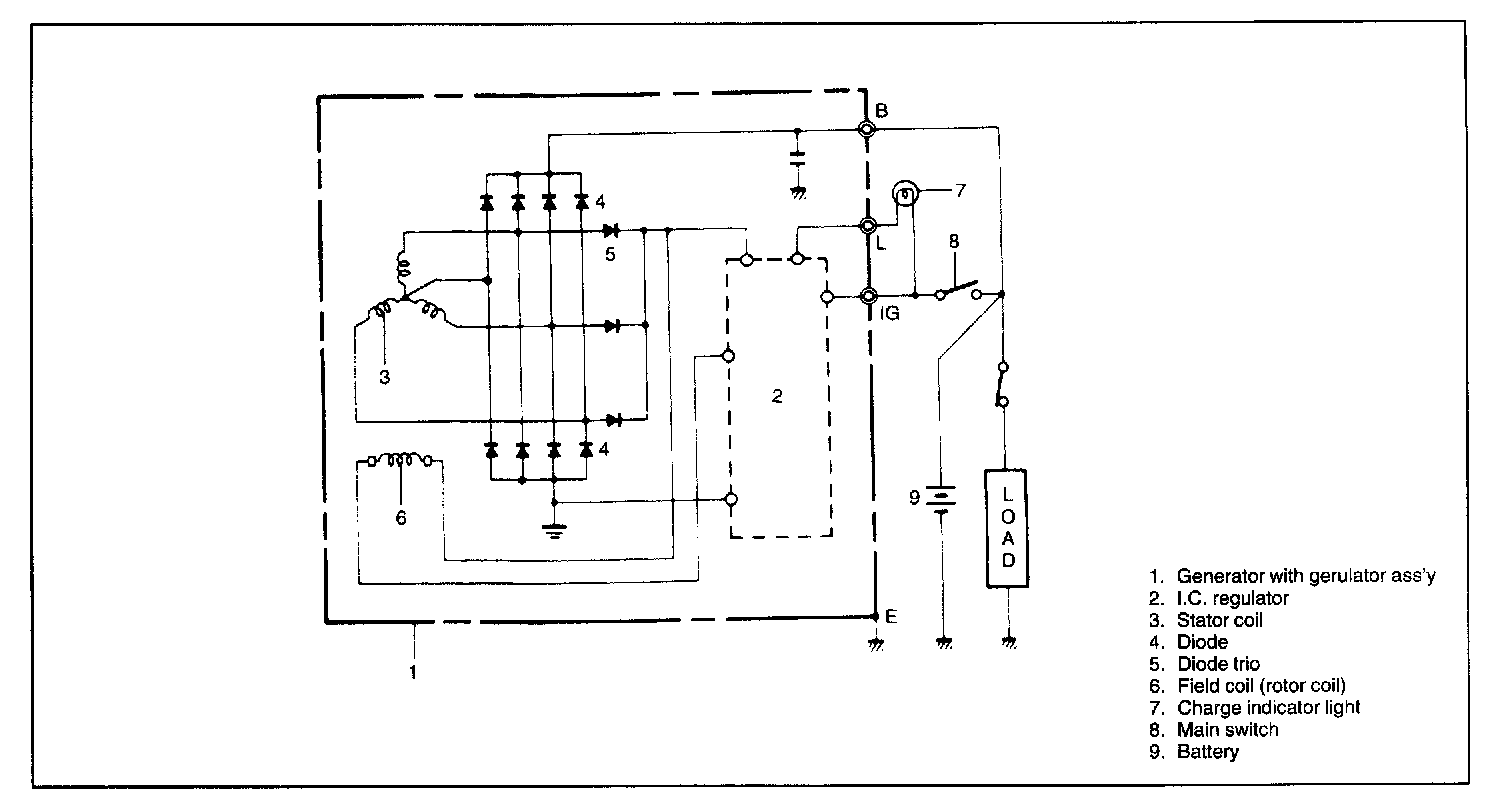 The basic charging system is the IC intregal regulator charging system. The internal components are connected electrically as shown.
