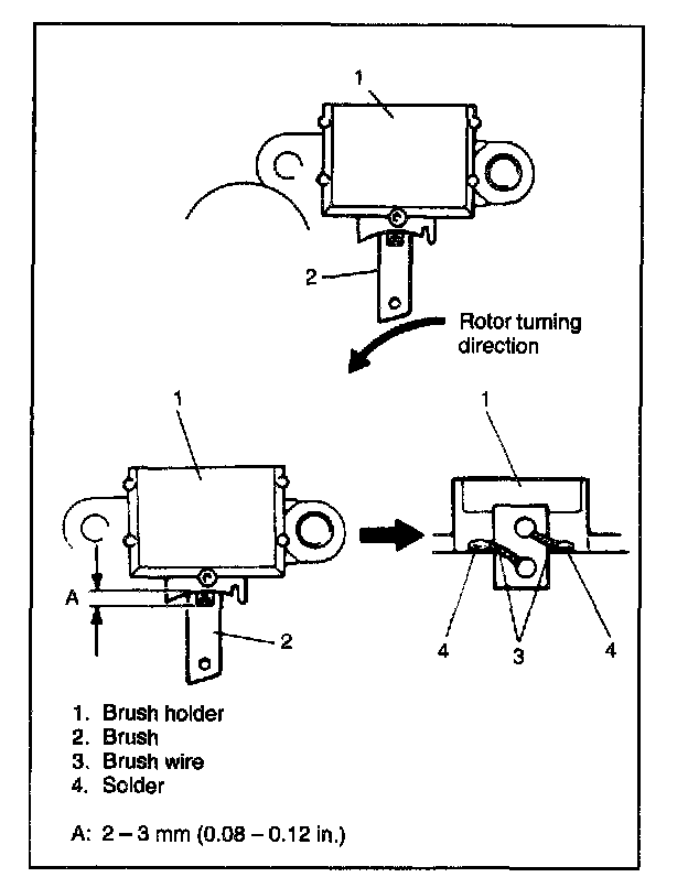 9. To remove brush, remove wire cover from brush holder and then disconnect brush wire from regulator terminal by using soldering iron.