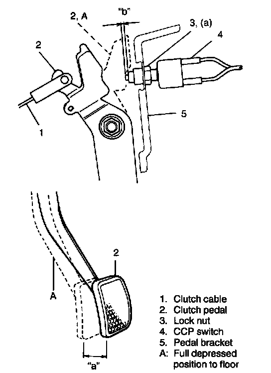 CAUTION: When clutch pedal is fully depressed, clearance "b" (remaining switch stroke) should be 1.0 - 2.0 mm (0.04 - 0.08 inch) with this adjustment. Maladjustment of "a" stroke may cause dragging clutch or impossible to engine start.