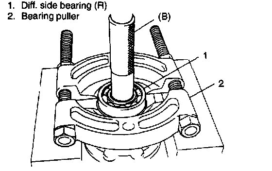 3. Remove diff. side bearing (R). Drive it out by using special tool, bearing puller and press.
