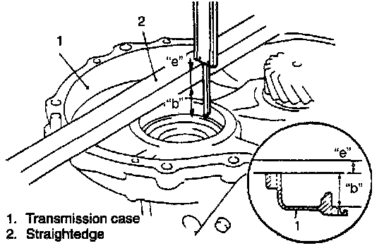 2. In the same manner as the above 1), measure dimension "b" of transmission case (from mating surface to bearing bore bottom).