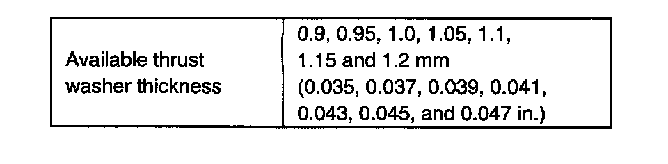 2. If thrust play is out of specification, select suitable thrust washer from among following available size, install it and check again that specified gear play is obtained.