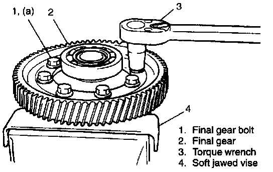 6. Hold differential assembly with soft jawed vise, install final gear and then tighten it with 8 bolts to specified torque.