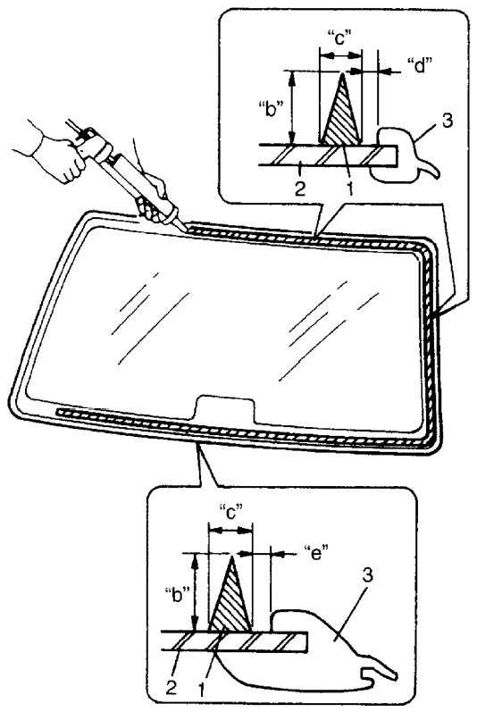 9. Apply adhesive (1) along upper and lower molding (3) as shown.