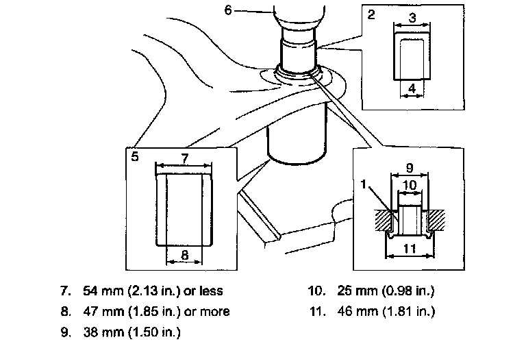 8. Remove suspension frame bushings (1) by using a pipe (2) whose outer diameter (3) is 37 mm (1.46 inch) and inner diameter (4) is 27 mm (1.06 inch) or more, an appropriate support (5) and hydraulic press (6).