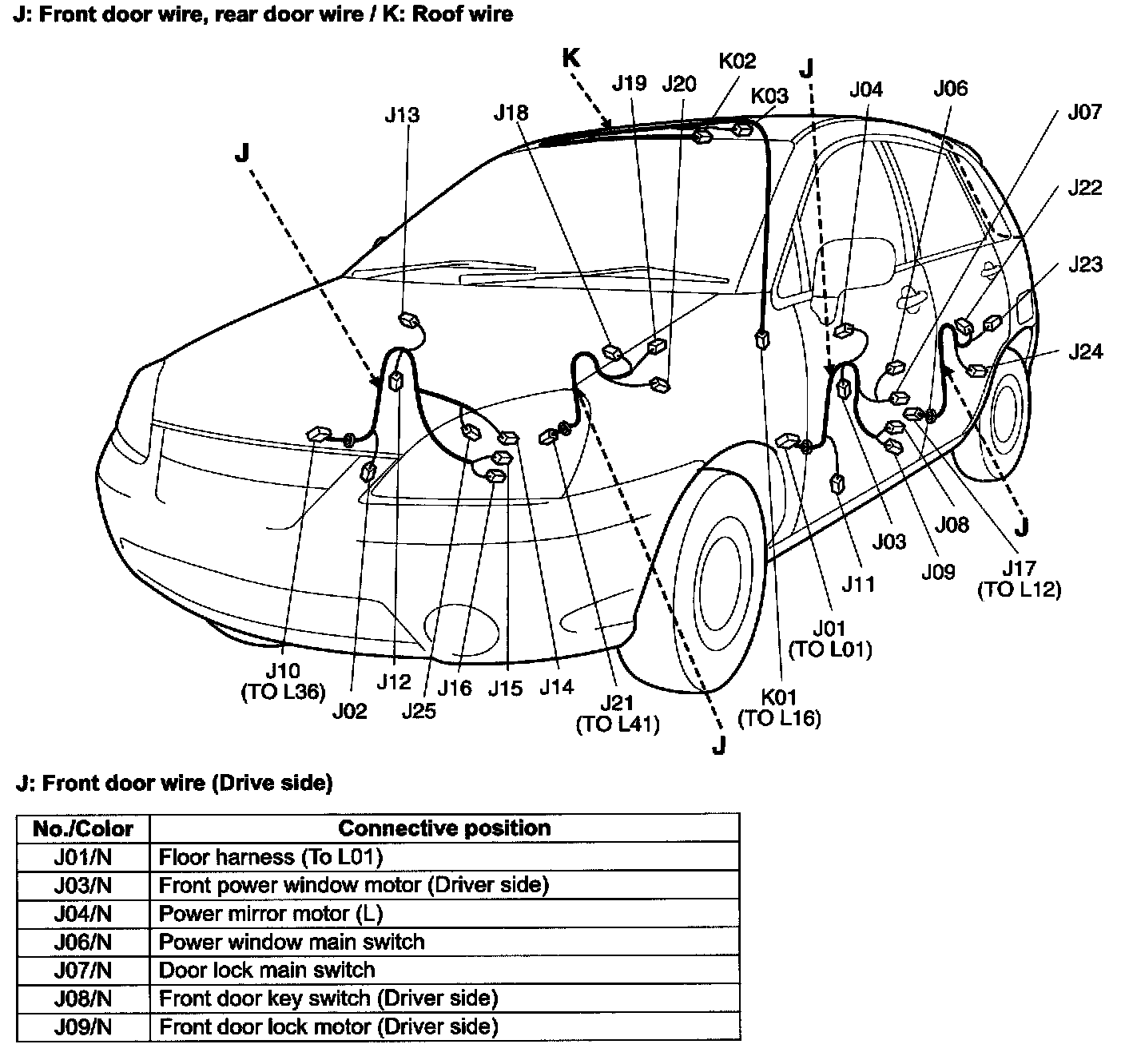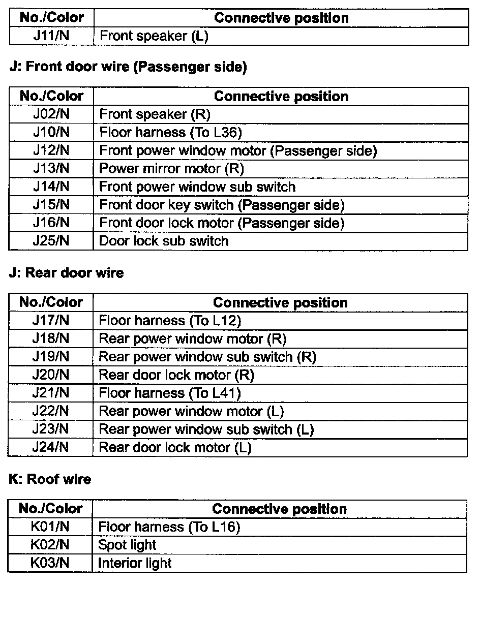 J: Front Door Wire, Rear Door Wire / K: Roof Wire - Connective Position (Contd):