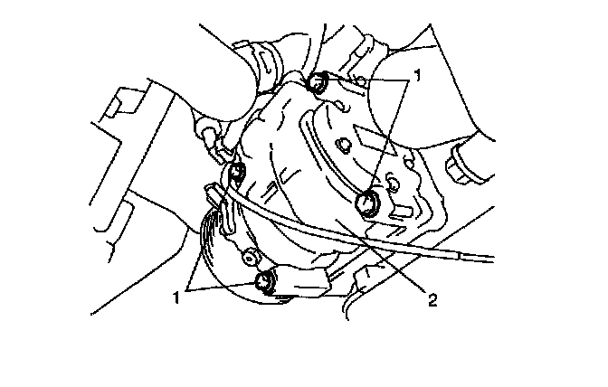10. Remove compressor mounting bolts (1), and then remove compressor (2) from its bracket.