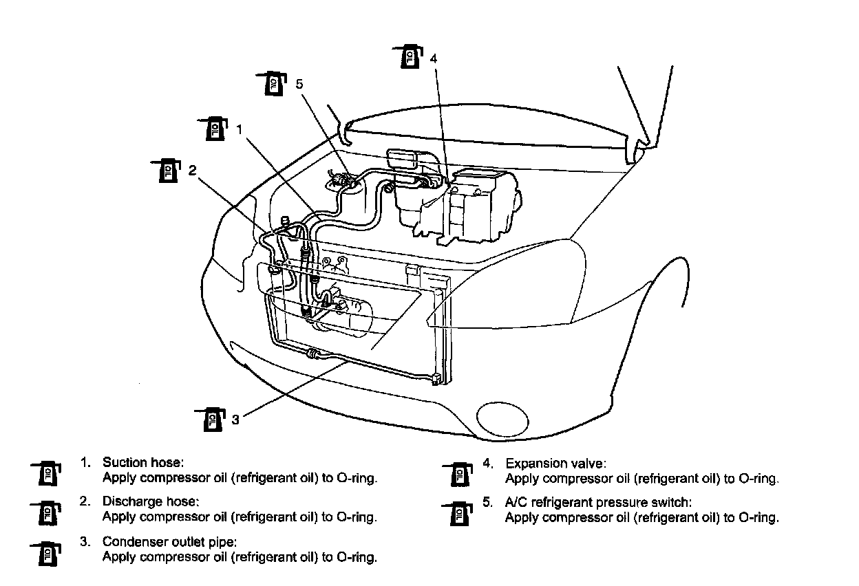 - When connecting hoses and pipes, apply a few drops of compressor oil (refrigerant oil) to seats of coupling nuts and O-ring.