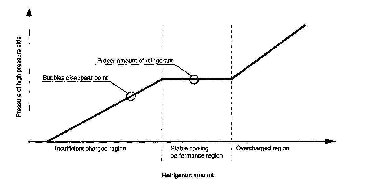 Because, in the sub-cool system, the point at which bubbles disappear is before the stable cooling performance region. If the charging of the refrigerant is stopped at the point in which bubbles disappear, it will be in insufficient charged region. Also, overcharging causes air-conditioning ability and fuel consumption aggravation.