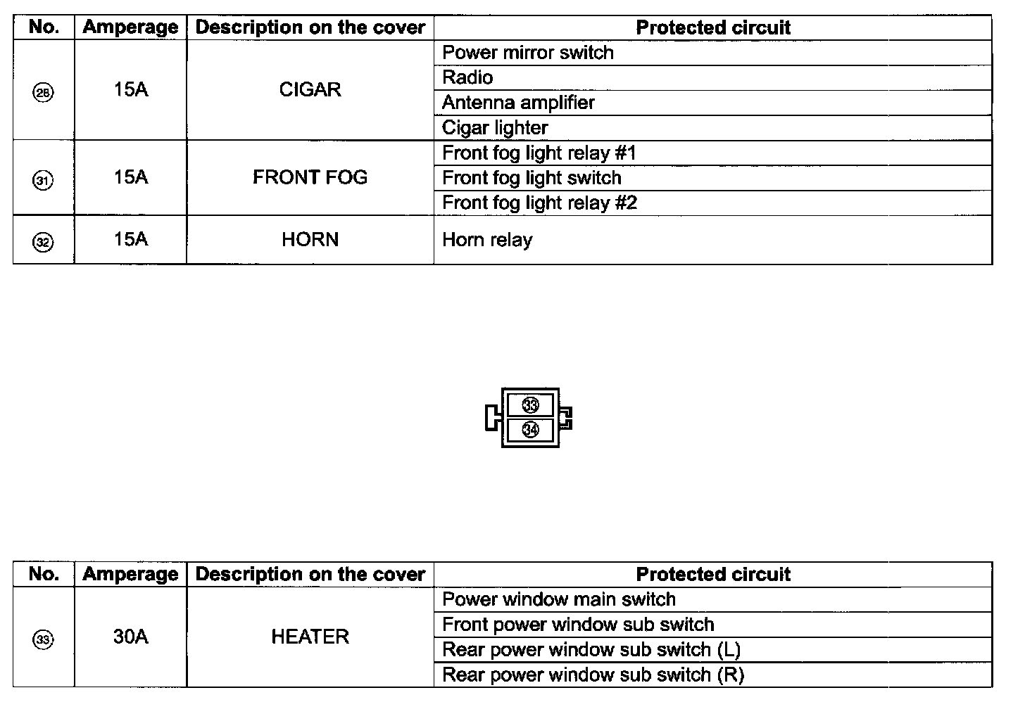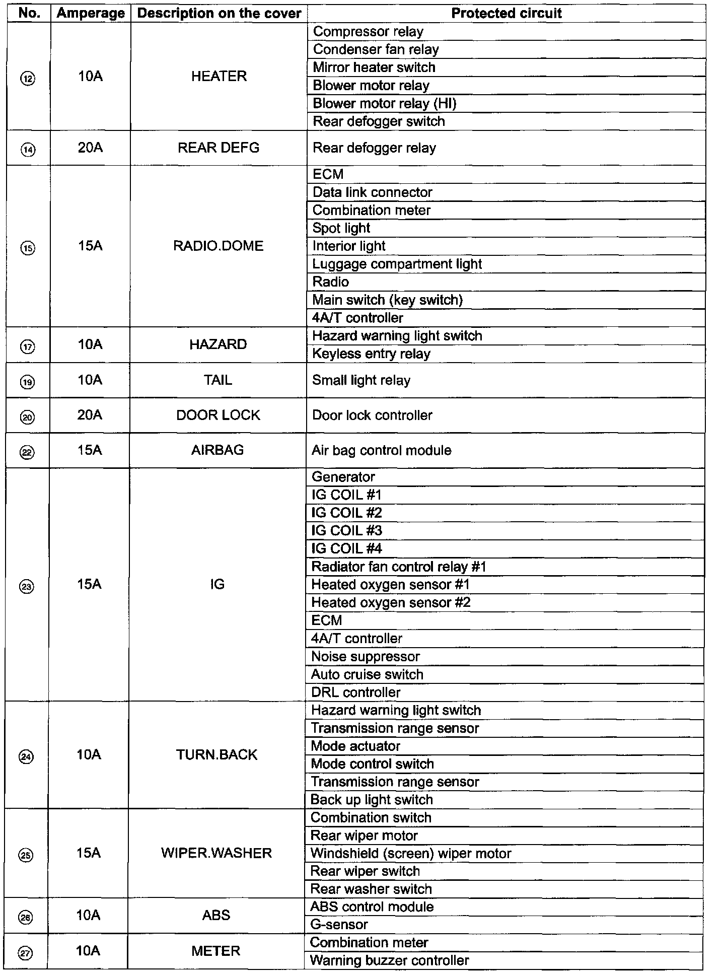 The above chart describes what parts each fuse protects.