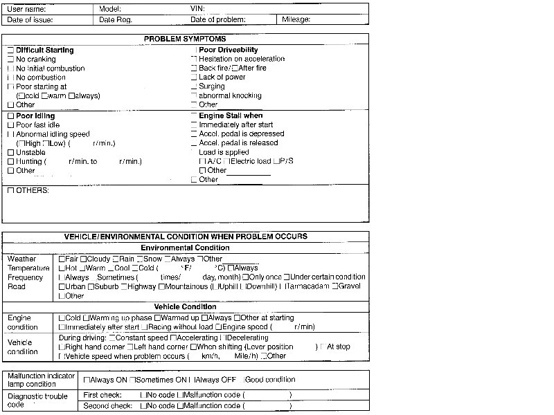 Record details of the problem (failure, complaint) and how it occurred as described by the customer. For this purpose, use of such an inspection form will facilitate collecting information to the point required for proper analysis and diagnosis.