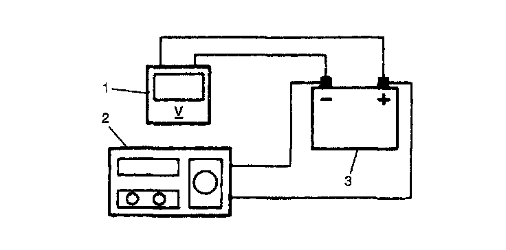 1. Connect voltmeter (1) and battery load tester (2) across battery (3) terminals.