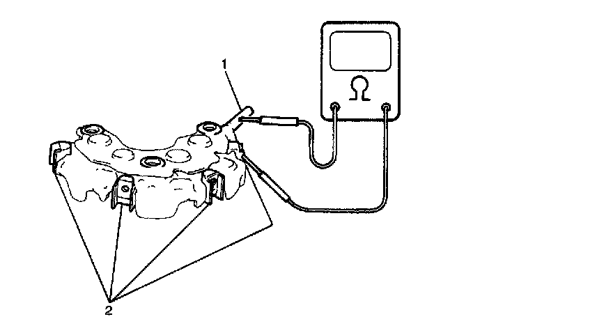 Rectifier1. Using an ohmmeter, connect one tester probe to the "B" terminal (1) and the other to each rectifier terminal (2).