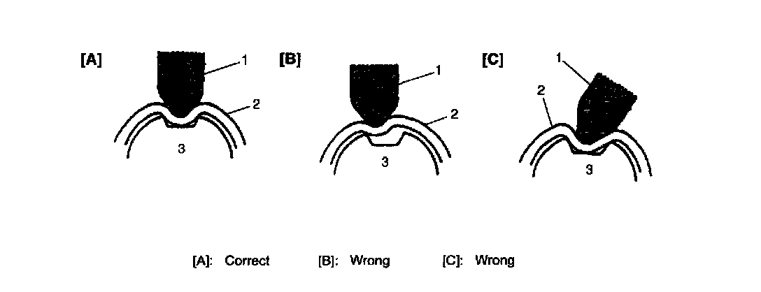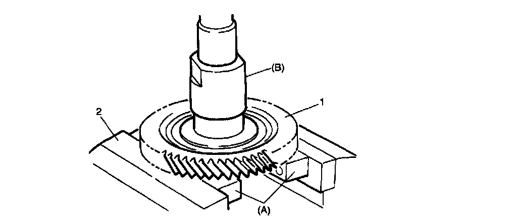 NOTE: When staking counter shaft driven gear lock nut (2), point a suitable staking tool (1) toward differential drive pinion shaft (3) axis center and stake lock nut securely, as shown in the figure. (Poor staking may cause abnormal noise.)
