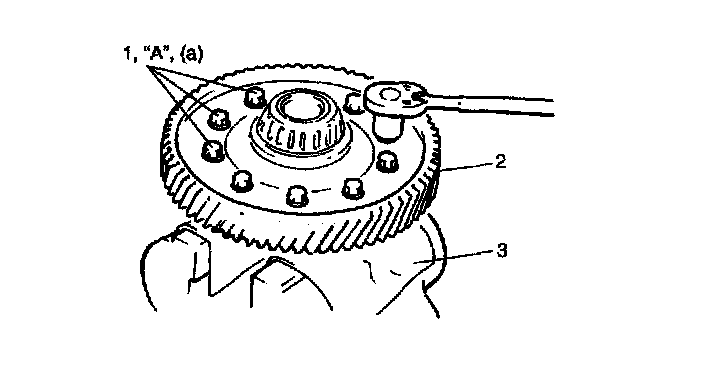 7. Hold differential assembly with soft jawed vise (3), install final gear (2) and then tighten 10 bolts) to specified torque.