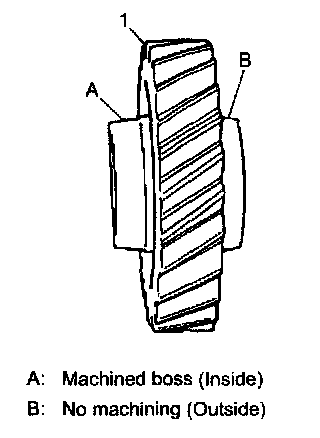 5. Install countershaft 5th gear (1) to countershaft facing machined boss A inward.