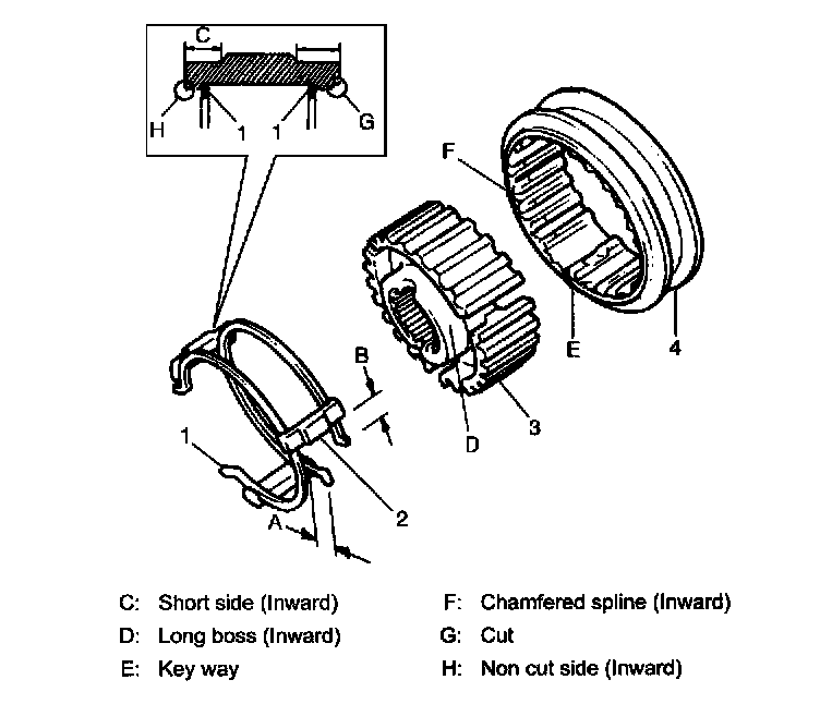 NOTE: Short side C in keys, long boss D in hub and chamfered spline F in sleeve should face inward (5th gear side).
