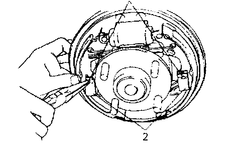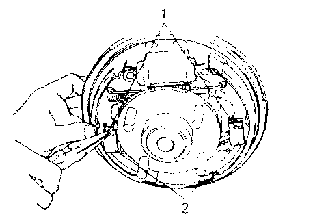 5. Remove parking brake shoe lever (2) from shoe rim.