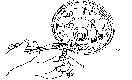 2. Remove shoe hold down springs (2) by turning shoe hold down pins (1).