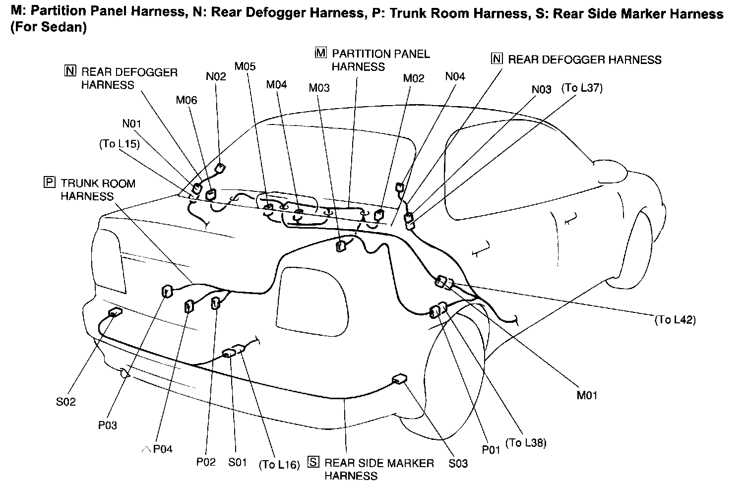 M: Partition Panel Harness, N: Rear Defogger Harness, P: Trunk Room Harness, S: Rear Side Marker Harness (For Sedan):