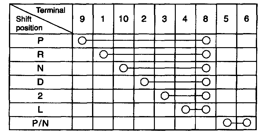 2. At each of "P", "R", "N", "D", "2" and "L" shift position, check continuity between terminals as well as each terminal and sensor case. Continuity should be indicated only between those terminals as shown in the figure at each shift position. Continuity should not exist between any terminal and sensor case. If malfunction is found, adjust or replace.