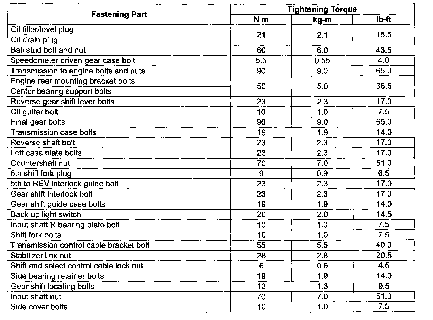 TIGHTENING TORQUE SPECIFICATIONS