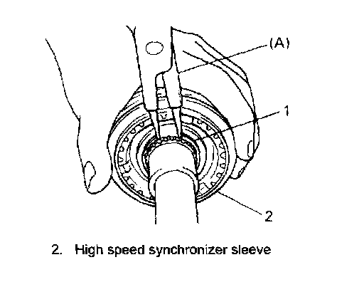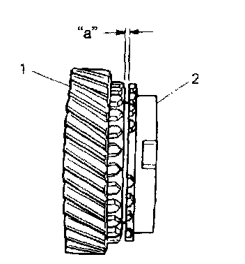 2. If synchronizer parts need to be repaired, check clearance "a" between ring (2) and gear (1), each chamfered tooth of gear, ring and sleeve, then determine parts replacement.