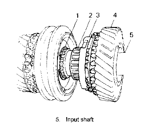 2. Drive out 5th gear spacer (2), L bearing (3) and 4th gear (4) all at once by using puller (5) and press.
