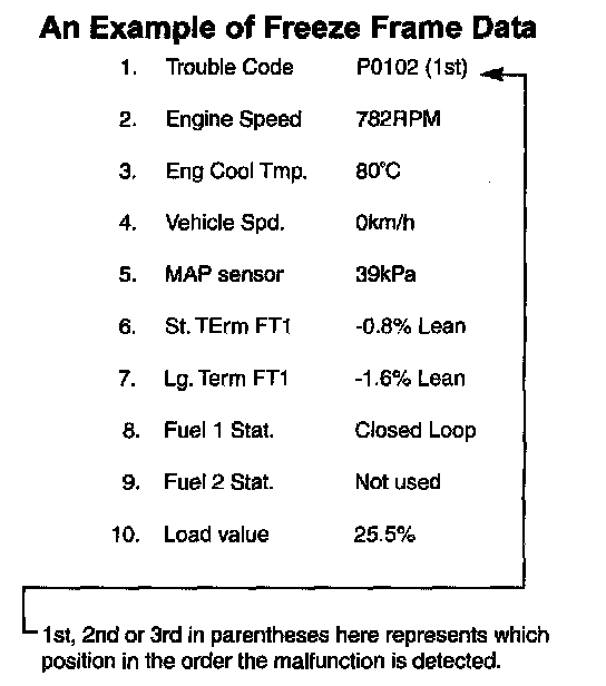 Therefore, it is possible to know engine and driving conditions (e.g., whether the engine was warm or not, whether the vehicle was running or stopped, whether air/fuel mixture was lean or rich, etc.) when a malfunction was detected by checking the freeze frame data. Also, ECM has a function to store each freeze frame data for three different malfunctions in the order as the malfunction is detected. Utilizing this function, it is possible to know the order of malfunctions that have been detected. Its use is helpful when rechecking or diagnosing a trouble.