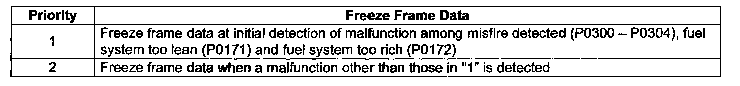 Shown in the table are examples of how freeze frame data are stored when two or more malfunctions are detected.