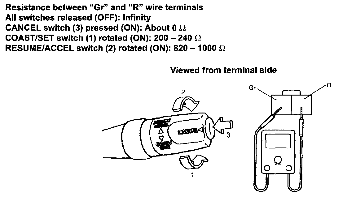 3. Check for resistance between "Gr" and "R" wire terminals of disconnected switch connector under each condition.