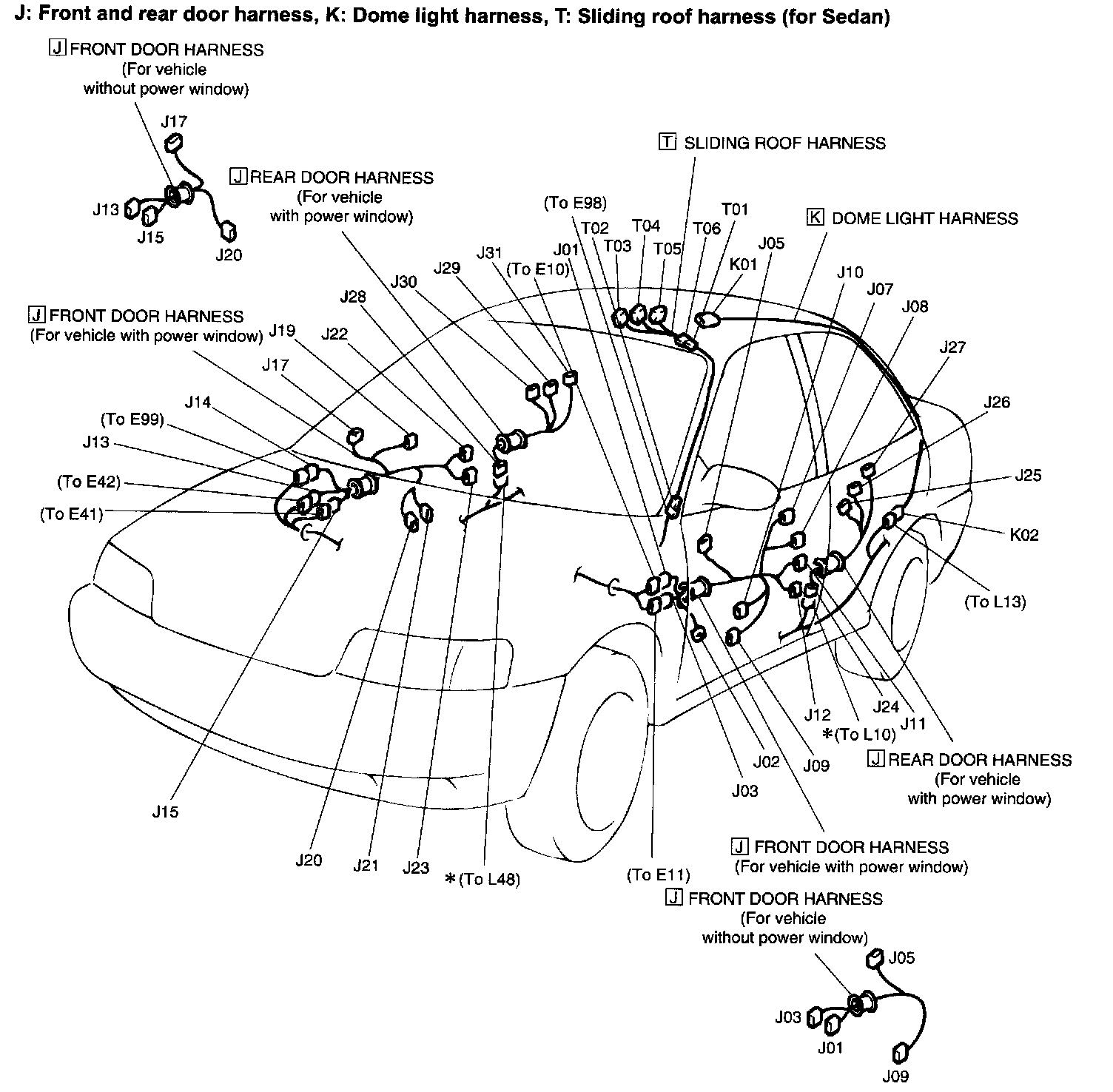 J: Front And Rear Door Harness, K: Dome Light Harness, T: Sliding Roof Harness (For Sedan):