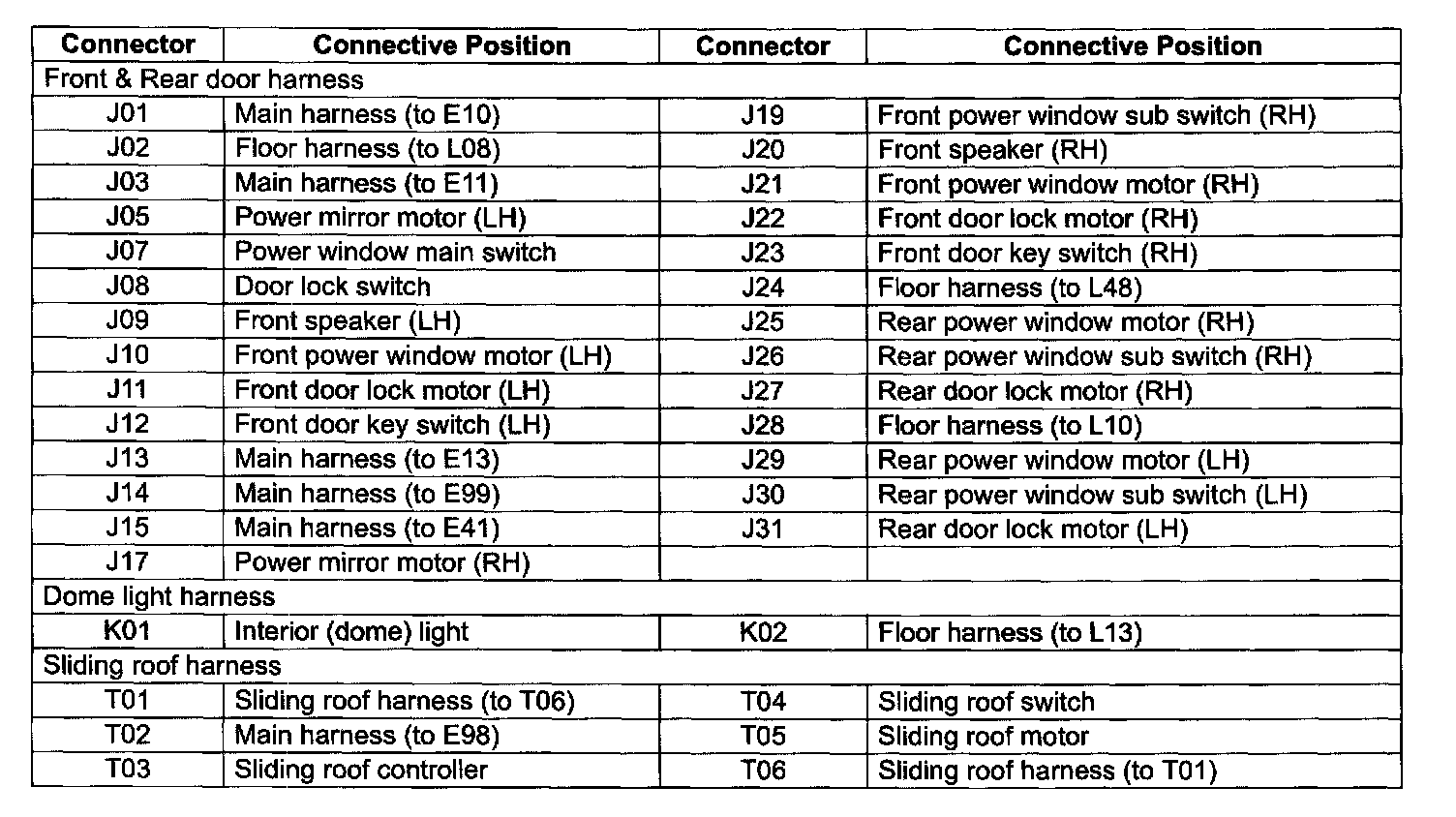 J: Front And Rear Door Harness, K: Dome Light Harness, T: Sliding Roof Harness (For Sedan) Connective Position: